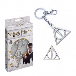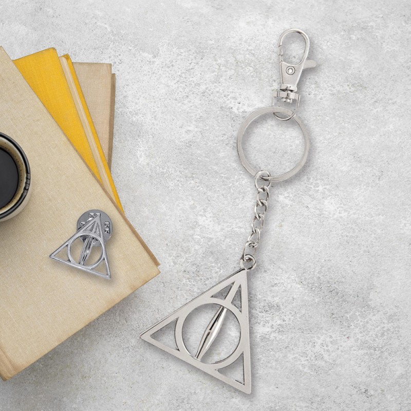 Un porte-clés métallique de 5 x 5 cm, en forme de triangle traversé d'un cercle et d'une ligne, symbolisant les trois reliques légendaires : la Cape d’Invisibilité, la Pierre de Résurrection et la Baguette de Sureau. Solide et esthétique, ce porte-clés s’accroche facilement grâce à son mousqueton pratique.
