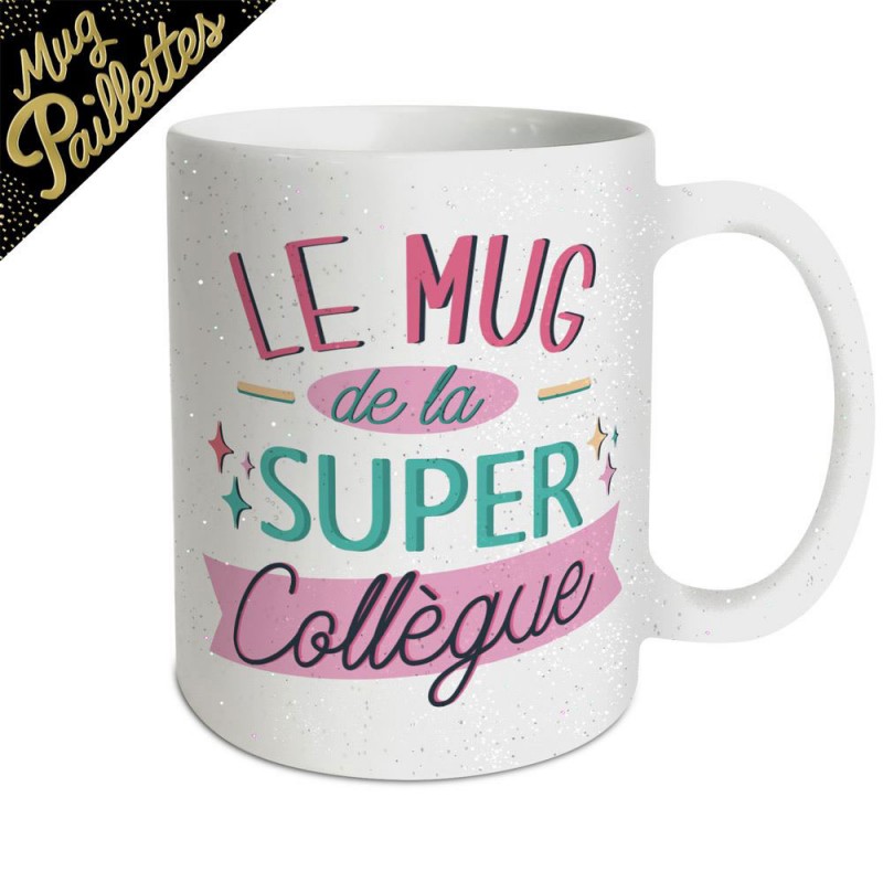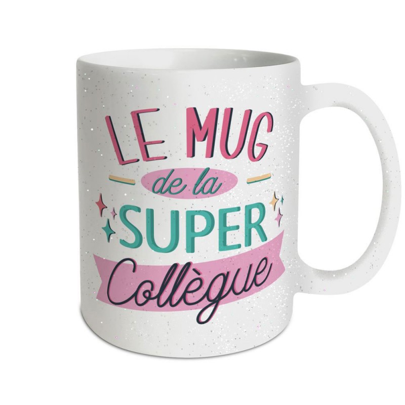 Un mug au design pailleté, tendance et féminin pour sa super collègue tant appréciée.Ce mug au design pailleté élégant attire immédiatement le regard. Son inscription « Le Mug de la Super Collègue » met à l’honneur celle qui illumine les journées de travail par sa gentillesse, son humour ou son professionnalisme... Message valorisant et positif, conception à paillettes scintillantes et touche de bonne humeur au quotidien : ce cadeau pour collègue est autant utile que décoratif !