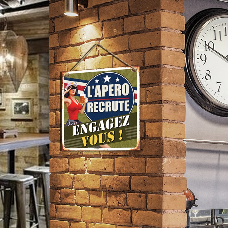 Avec sa corde de fixation murale, cette affiche en métal de 20 cm par 20 cm à l’aspect délicieusement vintage met à l’honneur l’inscription humoristique et fantaisie « L’apéro recrute : Engagez-vous ! »… Assumez votre amour inconditionnel pour les apéros estivaux !
