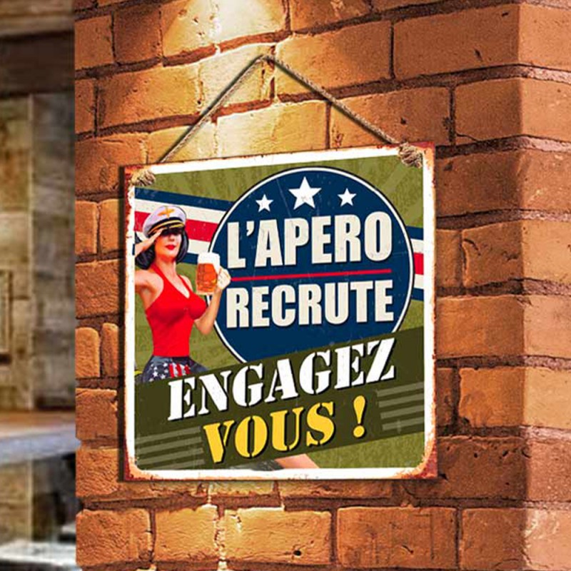 Ajoutez un petit air d’antan dans votre décoration intérieure avec cette plaque métallique reprenant une phrase de recrutement militaire… façon apéro !