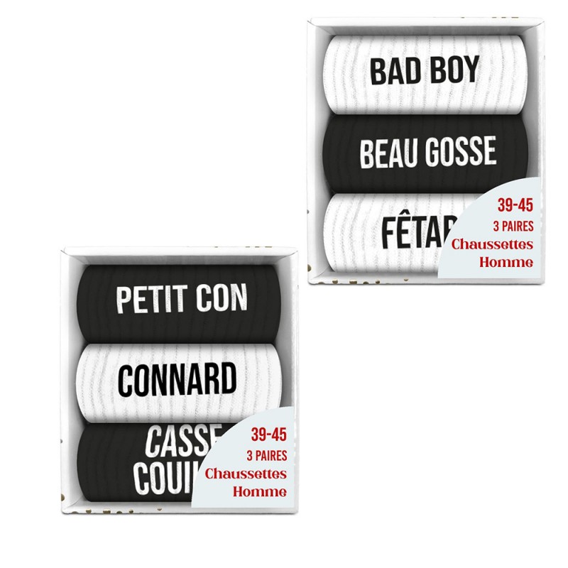 Portez avec humour ces trios de chaussettes insolites et décalées.Affirmez votre personnalité jusque dans les moindres détails avec le coffret de trois chaussettes noires et blanches. Bien plus qu’un simple lot de chaussettes, ce coffret est une véritable déclaration d’attitude. Drôle, décalé, parfois provocateur mais toujours assumé, il transforme un basique du dressing masculin en accessoire fort et expressif. Voilà un indispensable pour allier confort, style et autodérision au quotidien !