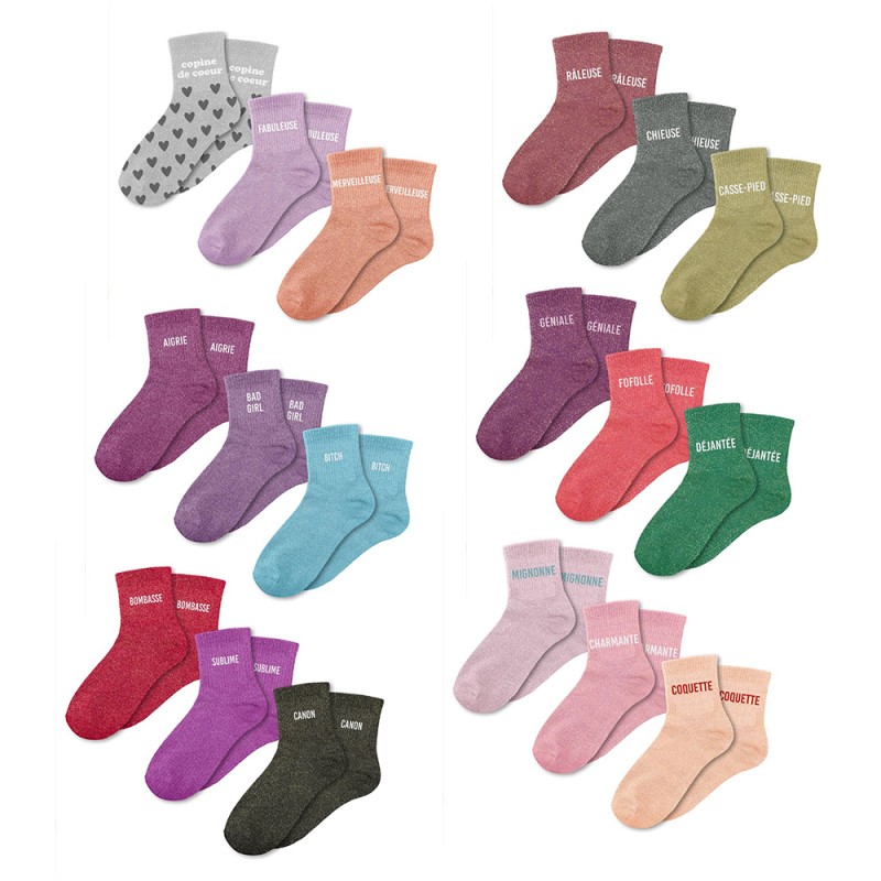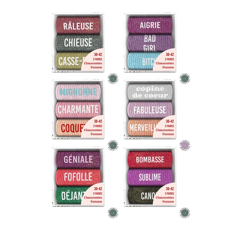 Ce coffret trio chaussettes paillettes fantaisie est l’accessoire parfait pour allier confort et originalité... Ce set contient trois paires de chaussettes scintillantes, aux couleurs variées et aux messages décalés, tendres ou humoristiques. Que ce soit pour une maman d’amour, une tata éclatante ou une amie pleine de répartie, chaque coffret propose une sélection unique qui correspond à différentes personnalités. Ces chaussettes amusantes, disponibles en taille unique (36-42), allient style et confort, tout en ajoutant une touche fun à chaque tenue !