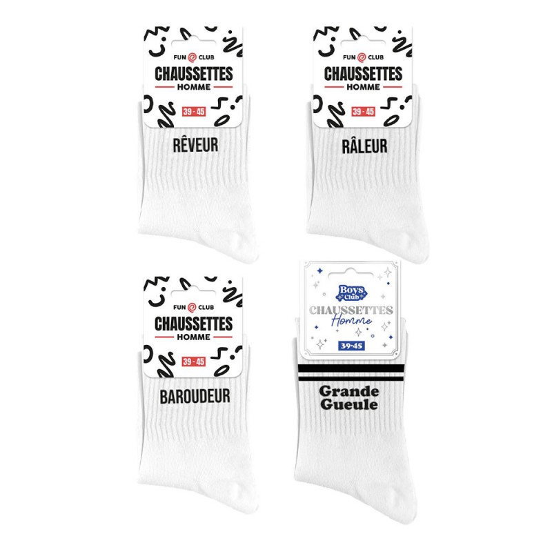 Osez l’humour avec style grâce aux chaussettes homme noires fantaisie à message !Affirmez votre personnalité avec les chaussettes homme blanches fantaisie à message : râleur, baroudeur, grande gueule ou rêveur ! Ces messages en font une idée cadeau personnalisée, facile à choisir selon la personnalité de celui qui les portera ! Elles conviennent aussi bien aux jeunes adultes qu’aux hommes plus mûrs, grâce à leur style universel et leur message décalé.